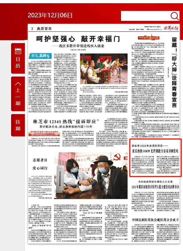 編者按:12月5日,西藏日報(bào)第二版高原要聞欄目報(bào)道了《那曲市2023年度保供項(xiàng)目—索縣熱熱50MW光伏儲能全容量并網(wǎng)發(fā)電》文章。全文如下: