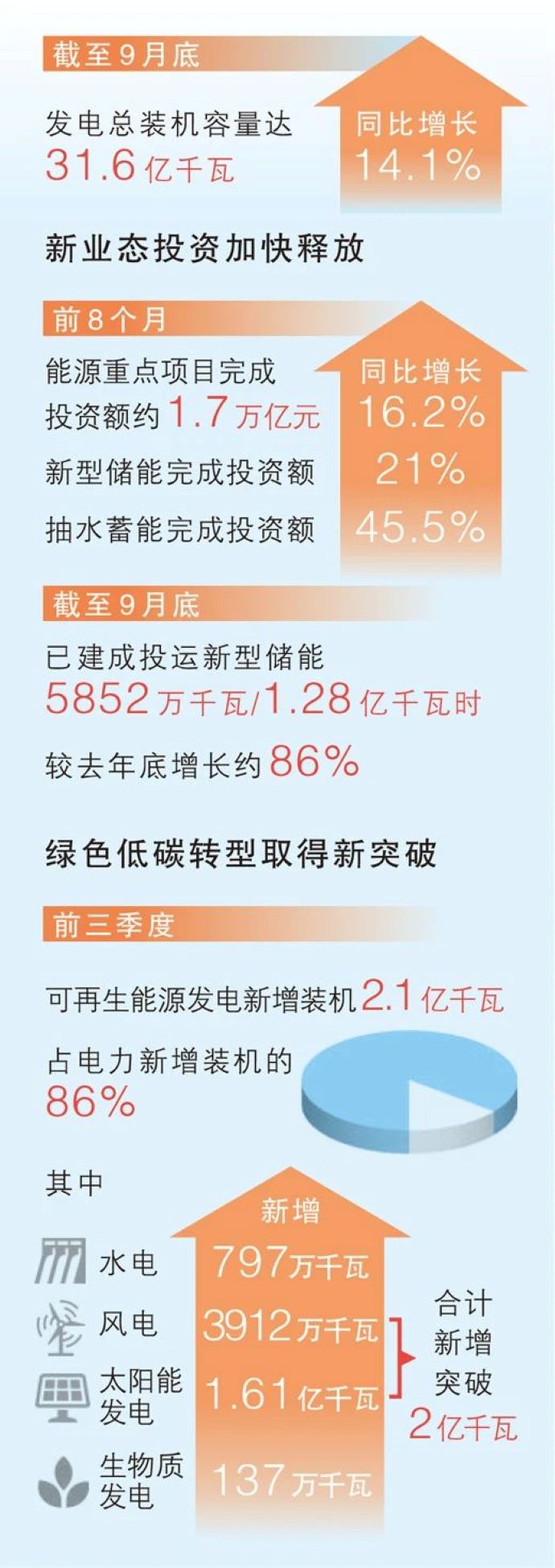 能源新業(yè)態(tài)投資多點開花。前8個月,新型儲能完成投資額同比增長21%,抽水蓄能完成投資額同比增長45.5%。甘肅、青海、新疆一批多能互補清潔能源基地項目有序推進,內蒙古在建綠氫制備項目、河南在建加氫設施項目持續(xù)形成有效投資。