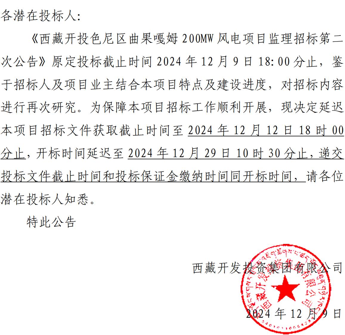 關(guān)于延長《西藏開投色尼區(qū)曲果嘎姆200MW風(fēng)電項(xiàng)目監(jiān)理招標(biāo)第二次公告》投標(biāo)截止時(shí)間的公告