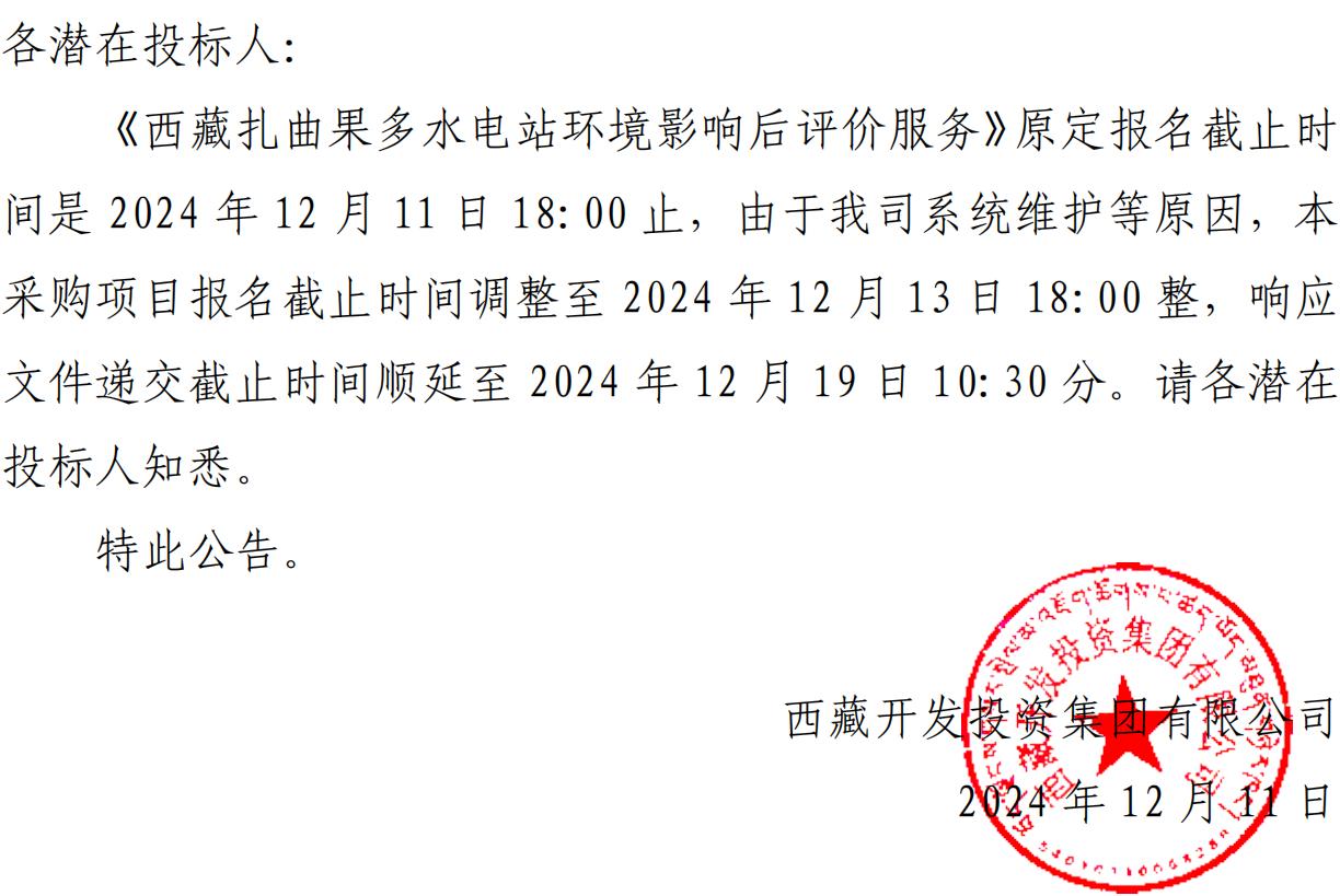 關(guān)于延長《西藏扎曲果多水電站環(huán)境影響后評價服務》詢價報名截止時間的公告